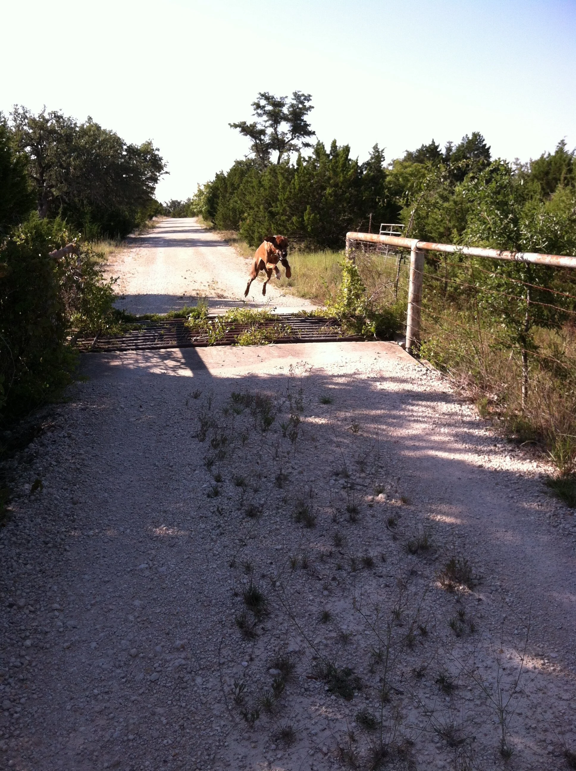 Image: the author’s dog, Shasa (2011- Easter Day 2020), jumps a cattle guard at the family ranch.